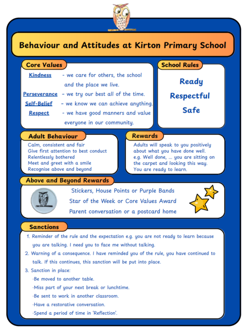 At Kirton Primary School, we believe that excellent behaviour and positive attitudes are the foundation of effective learning, strong relationships and personal success. Our policy is rooted in respect, kindness and responsibility. We aim to create a safe, calm and purposeful environment in which all children can thrive, both academically and socially.