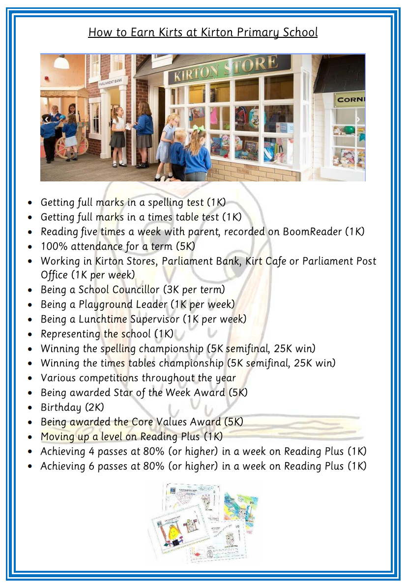 Kirton Primary School is proud to introduce ‘Learn and Earn’ - our unique Shop and Bank system.